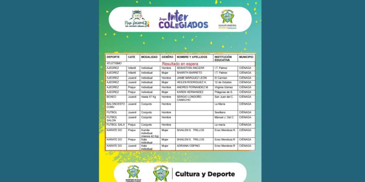 Las instituciones educativas del municipio de Ciénaga que clasificaron a la Final Departamental en las diferentes disciplinas deportivas, se encuentran I.E de Palmor, El Carmen, 12 de Octubre, Virginia Gómez, Pitágoras de Samos, San Juan del Córdoba, La María, Sevillano, Manuel J. del Castillo y Enoc Mendoza Riascos.