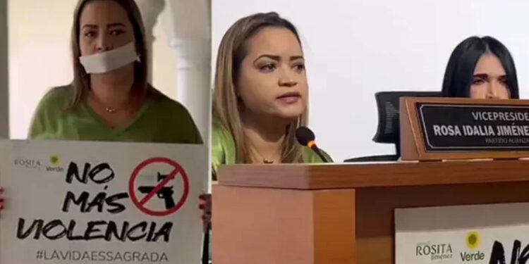 La diputada del Magdalena Rosita Jiménez se presentó a la Asamblea con una mordaza en señal de que quieren silenciarla por las denuncias que ha venido haciendo por el accionar criminal y delincuencial de organizaciones al mar gen de la ley. De acuerdo con la diputada, actores que hicieron parte de grupos armados ilegales estarían amenazándola.