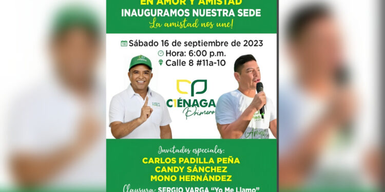 Este sábado 16 de septiembre se inaugurará la Sede Política del Mono Hernández en Ciénaga, ubicada en la calle 8 con Carrera 10b Esquina. En esta importante actividad política, harán presencia como invitados especiales el Candidato a la Alcaldía de “Ciénaga Primero”, Carlos Padilla Peña; la Candidata a la Asamblea Candy Sánchez y el anfitrión el Medico Edilberto “El Mono Hernández”. Los Esperamos!